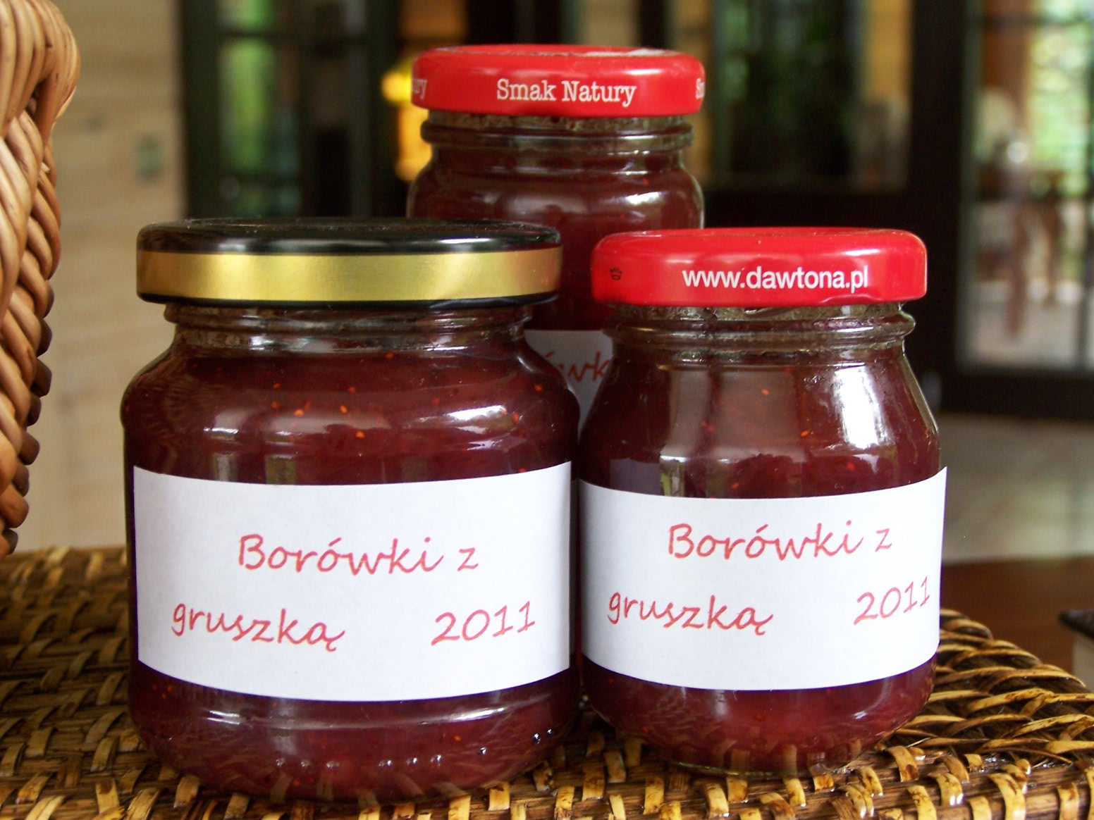 Krótko myję pod bieżącą wodą, wybieram niedojrzałe i zepsute, wrzucam do garnka, zasypuje cukrem. Same w sobie borówki są lekko cierpkie i gorzkawe. Zwykle dodaje się do nich inny owoc dla zrównoważenia smaku. Robiłam eksperymenty z jabłkami i brzoskwiniami i muszę przyznać, że staropolska gruszka jest najlepsza. Tak więc obieram gruszki. Dziś użyję konferencji bo tylko takie udało mi się kupić. Kroję w drobną kostkę, zasypuje cukrem i w oddzielnym garnuszku duszę do miękkości tak, żeby zostały kawałki owoców. Smażenie w jednym garnku jest możliwe tylko pod warunkiem, że wiemy ile czasu potrzebują gruszki żeby zmięknąć. Oczywiście kosztuję. Ufam swojemu smakowi i upodobaniom. Dosładzam lub dosalam a jak trzeba dokwaszam. Na koniec je łączę i gorące układam w małych słoiczkach, odwracam do góry dnem i zostawiam do rana. Można dodać przyprawy np goździki, anyż lub cynamon. Ja lubię baz dodatkowych aromatów. Święta i tak pachną cynamonem.
