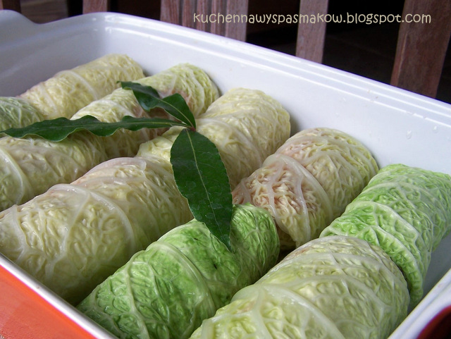 Układam ciasno w naczyniu do zapiekania, podlewam pozostałym bulionem.